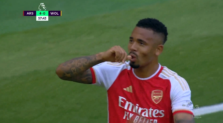 5月29日讯 英超收官战,阿森纳vs狼队,下半场第38分钟,热苏斯破门!阿森纳4-0领先。
