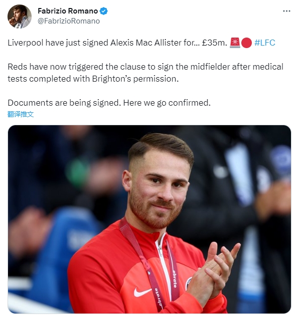 罗马诺:利物浦以3500万英镑的价格签下了麦卡利斯特。在布莱顿允许的情况下完成体检后,红军现在触发了签下这名中场球员的条款。正在签署文件,Here we go确认!
