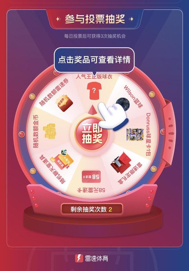 抽奖奖品池及中奖概率明细如下:1.里程碑奖励当投票数量达到50次时:随机聊天室道具当投票数量达到100次时:“萌神出击”挂件(有效期:365天)当投票数量达到300次时:“王之凝视”挂件(有效期:365天)当投票数量达到500次时:58元雷速卡2.转盘抽奖人气王正版球衣雷速限定礼盒Wilson篮球Donruss球星卡58元雷速卡随机聊天室道具随机数额雷速券随机数额金币若用户抽中实体奖品,雷速工作人员会在投票活动截止后私信联系您沟通邮寄方式,请届时注意查收私信。四、特别说明1.本次活动完全免费,不收取任何费用,亦不需要消耗任何APP内道具,请广大用户擦亮双眼,谨防上当受骗;2.本次活动仅用于统计雷速体育用户心目中喜爱、受欢迎的运动员,由此产生的数据及结果仅来自用户的投票及个人选择,且结果不用作任何其他用途;3.本次活动由雷速体育单独作为主办方面向雷速用户举办,本次活动所涉及的运动员与活动主办方之间不存在代言、签约以及合作等任何商业关系;4.为保障相关运动员、雷速体育用户以及相关权益人的意见与表达,本次活动设立的专门的沟通渠道。如任何运动员或相关权益人存在意见,可通过邮件向legal@leisumail.com反映,雷速体育将第一时间处理。点击前往活动投票页面>>>