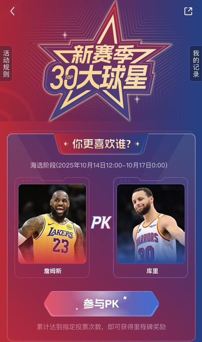 2025-26赛季NBA常规赛将于10月22日正式开战,作为本赛季开赛前的开胃菜,我们特别为老哥们准备了新赛季NBA30大球星的评选活动,活动于2025年10月14日开始并为期一周至10月20日结束。此次活动将会分为两个阶段,第一阶段于今日正式开启,广大老哥们可以从雷速编辑部根据用户搜索习惯以及喜爱程度选出的NBA球员大底池中进行两两PK,选出你心目中更喜爱的那个TA。老哥们在参与活动的过程中,我们也有丰厚奖品相送,每进行一次PK就可以获得抽取转盘的机会,在达到PK次数时,更有专属设计的限定款挂件相送。若足够幸运,还有机会获得NBA正品球衣一件,欢迎各位老哥多多参与。点击前往活动投票页面>>>点击前往活动投票页面>>>点击前往活动投票页面>>>投票与抽奖规则:一、活动时间用户海选阶段:北京时间2025年10月14日12:00开始,截止时间为2025年10月17日0:0030强排名阶段:北京时间2025年10月17日12:00开始,截止时间为2025年10月20日12:00二、活动规则