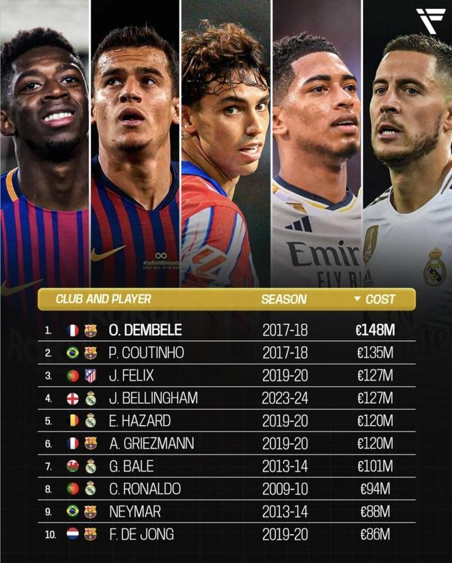 最近有媒体盘点了西甲历史最昂贵的十大引援(单位:亿欧元),榜单几乎被巴萨、皇马与马竞包揽。整体看,真正“值回票价”的,是健康稳定、定位清晰且关键战能兑现的类型(如C罗、贝林厄姆);而“翻车”多因伤病叠加战术不适配(阿扎尔、库蒂尼奥最典型)。结论很直白:高价只是门票,持续出勤与体系匹配才决定回报。具体榜单登贝莱(OusmaneDembélé)国籍:法国俱乐部:巴塞罗那赛季:2017-18转会费:1.48亿欧元转会后表现评价:伤病频仍但持球推进与爆点价值明显近两季回暖|性价比评分:5.5/10库蒂尼奥(PhilippeCoutinho)国籍:巴西俱乐部:巴塞罗那赛季:2017-18转会费:1.35亿欧元转会后表现评价:定位与体系不匹配表现低于预期租借期短暂回光|性价比评分:3/10