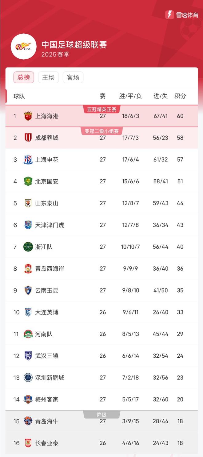 雷速体育10月31日讯 北京时间今晚,中超倒数第二轮打响,前三名上海海港、成都蓉城和上海申花先后出战,且海港最快今晚夺冠。争冠形势:海港最快今晚夺冠目前的积分榜中,上海海港积60分排在榜首,领先成都蓉城1分,申花积58分排在第三位。本轮中超,三队均主场作战,上海海港18点率先登场,球队若战胜浙江队,且成都蓉城不敌河南、上海申花不胜深圳新鹏城,则海港提前一轮实现三连冠,夺得队史第四座中超冠军奖杯。中超今日赛程18:00 上海海港vs浙江队19:35 成都蓉城vs河南队20:00 上海申花vs深圳新鹏城中超最新积分榜