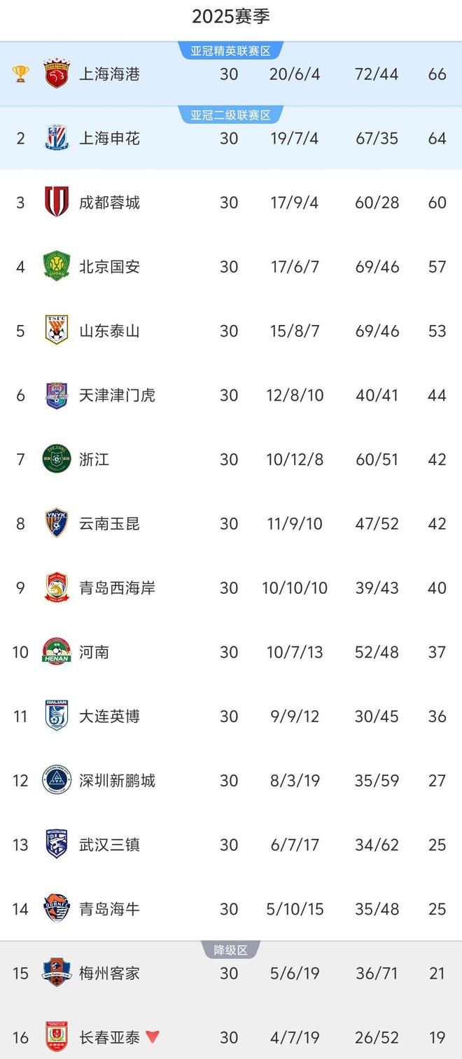 中超30轮积分榜:上港力压申花夺三连冠,保级线仅25分,梅州降级