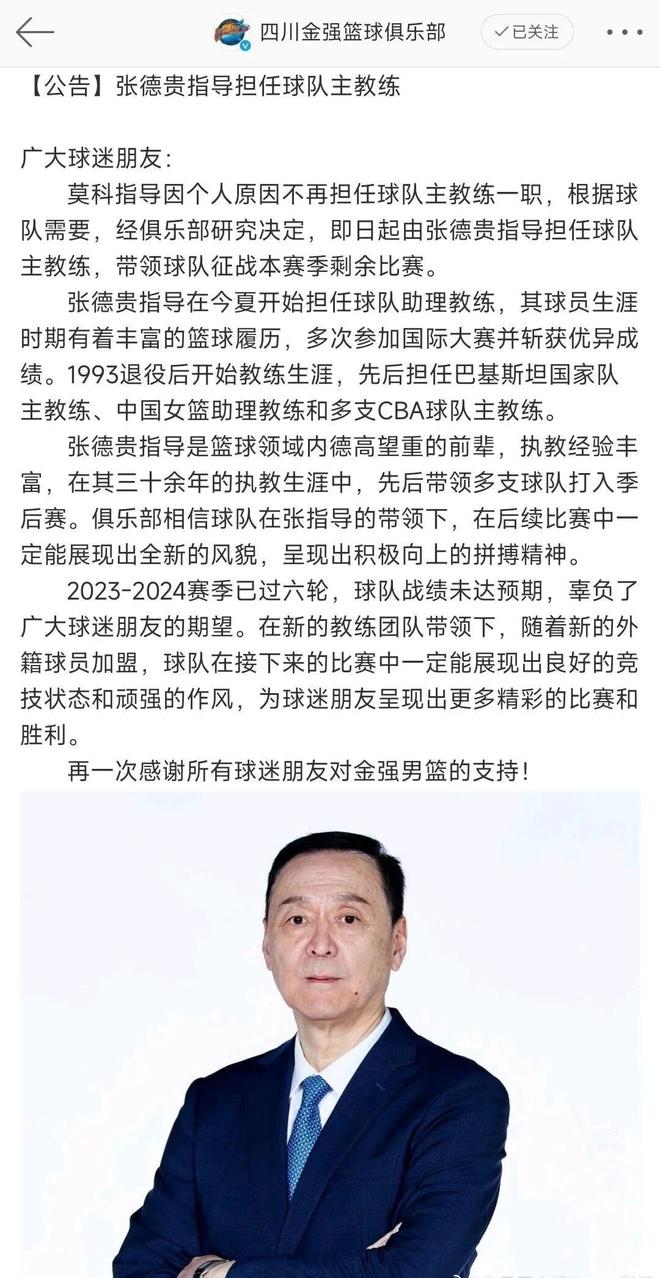 值得一提的是,张德贵不是第一次扮演“救火教头”。 2021年他接替外教凯撒执教天津队时,就曾带领球队时隔8年重返季后赛。